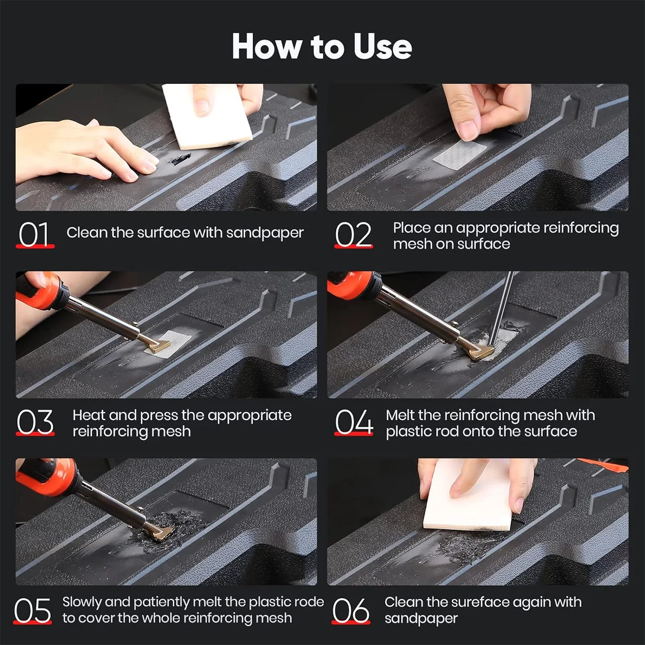 The nice way for repairing most modern products which are made of plastics. Suitable for repairing and reinforcing plastics parts of all automobiles, such as bumpers, dashboards, lamp holders, plastics rings, and daily plastics supplies.