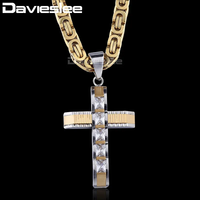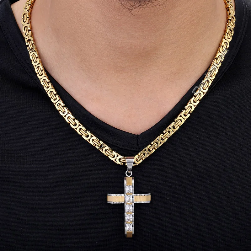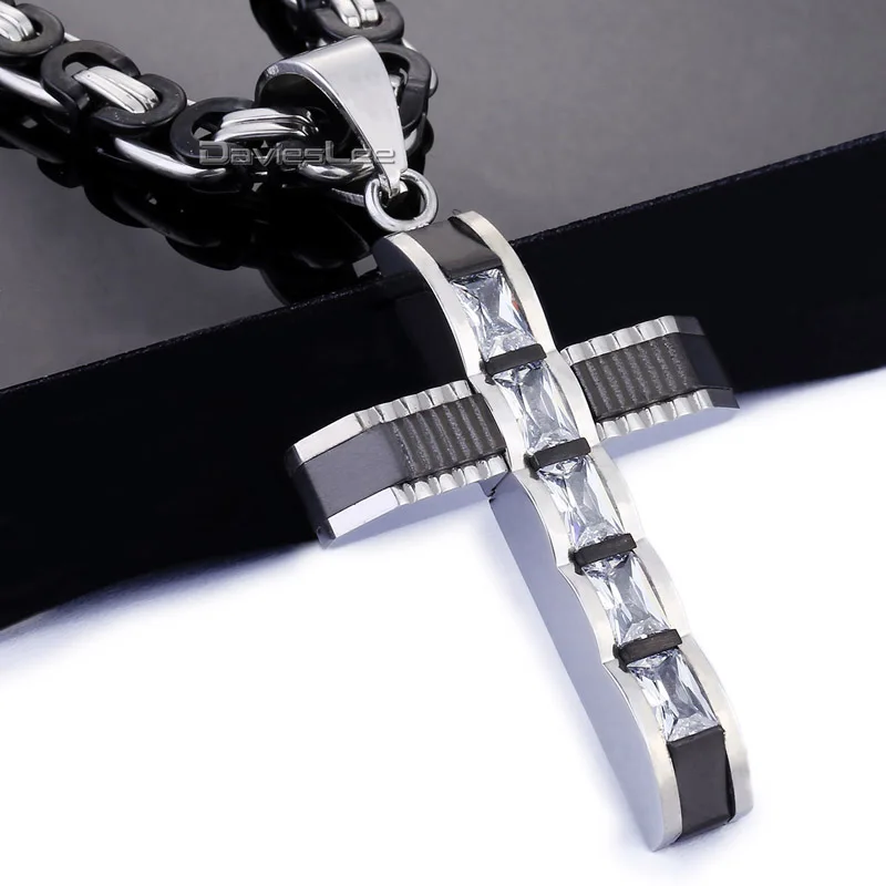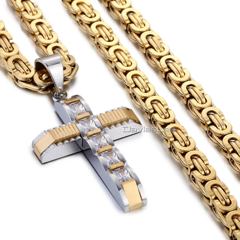 Cross Pendant Necklaces for Men Stainless Steel Byzantine Chain Gold Black Silver Color Mens Necklaces CZ Rhinestone DLKPM86