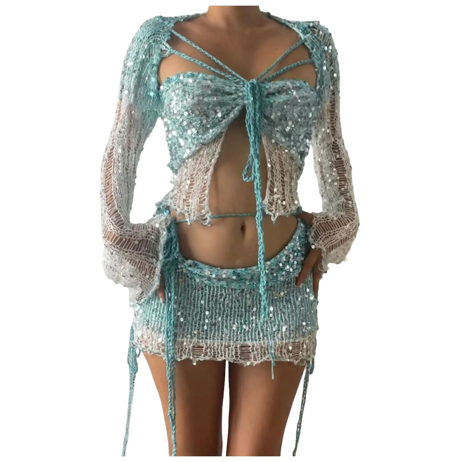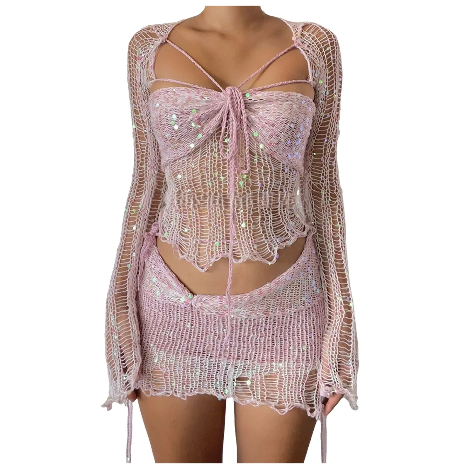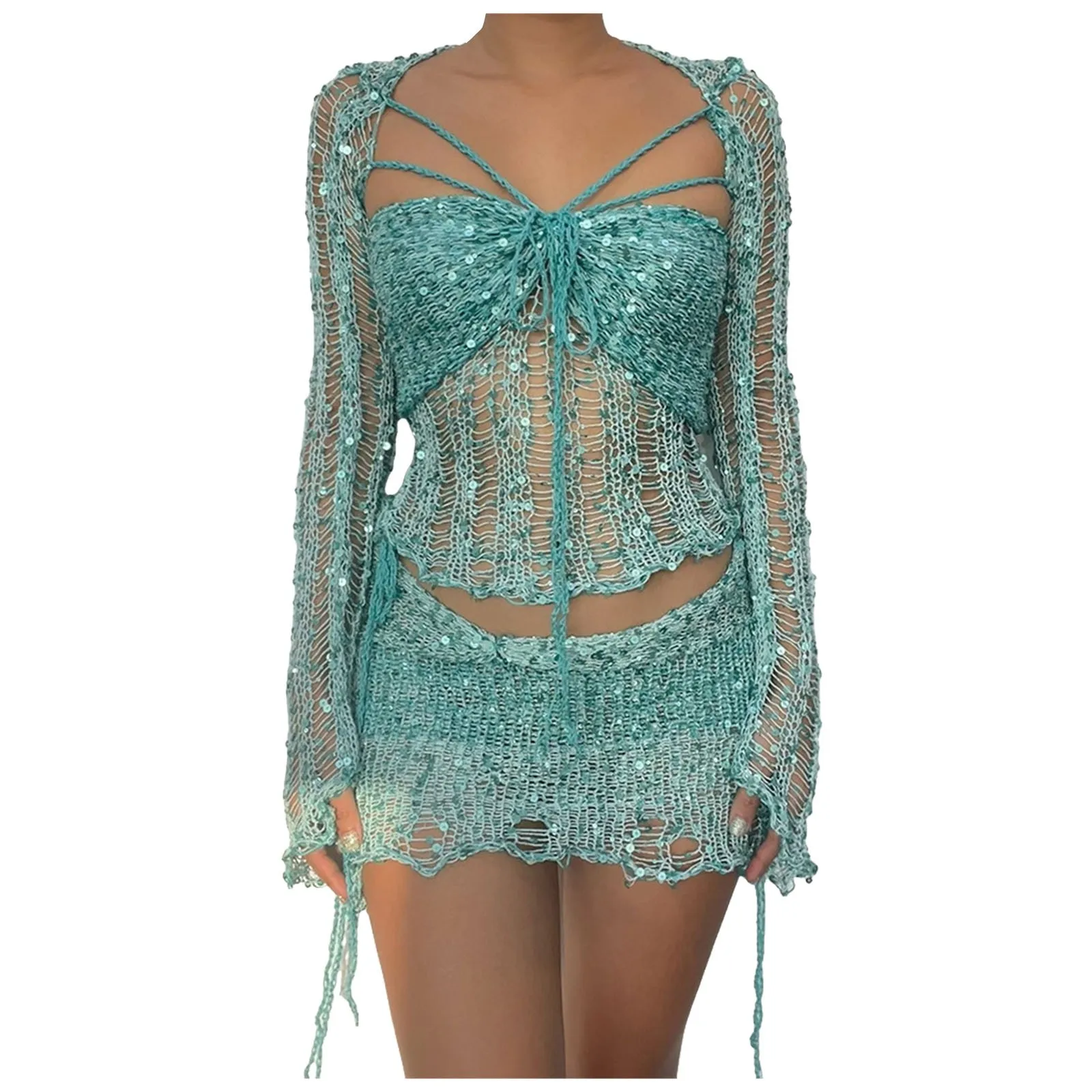 Glitter Sequins Knitted Skirt Sets Women Fashion Hollow Sequins Bandage Tube Top Mini Skirts 3 Piece Outfit Vacation Clothing