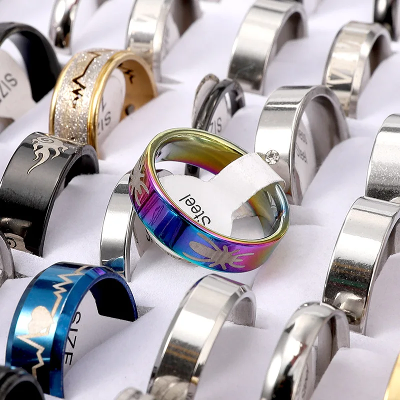 Wholesale 100 Pcs/box Fashion Stainless Steel Love Stripe Rings Punk Trendy Jewelry For Women Men Mix Style Size Party Gift